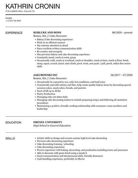 Cake Decorator Resume Sample - 4.8 (153 votes) table of contents. 10 cake decorator resume examples and templates for 2024. Based on the most successful resume samples, cake decorators should have a steady hand and demonstrate creativity, artistic. Are you passionate about creating beautiful and delicious cakes? If so, this article is the perfect place to start.
